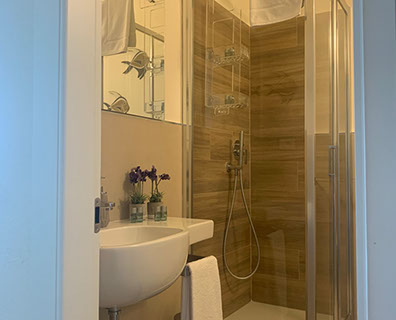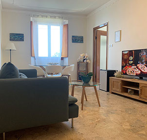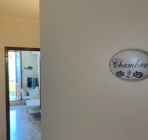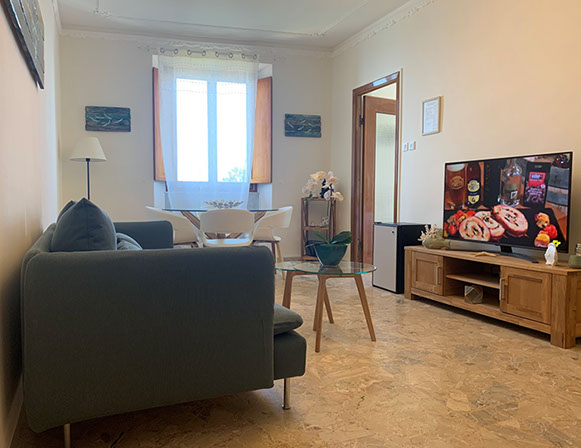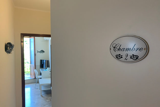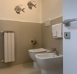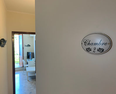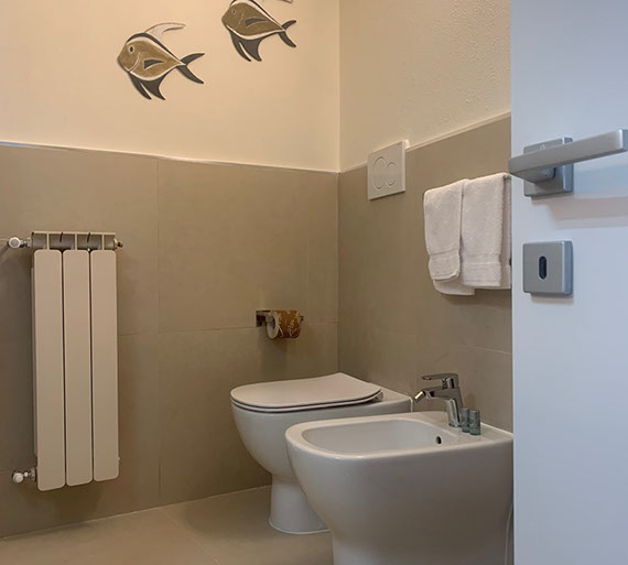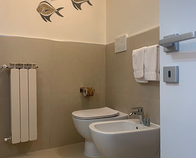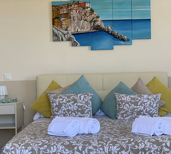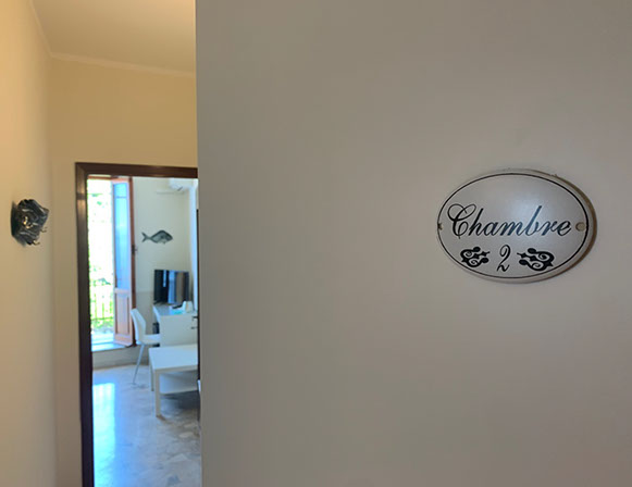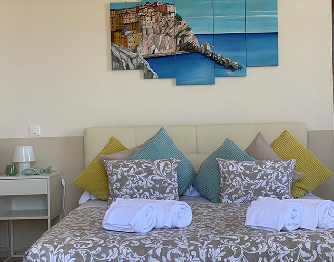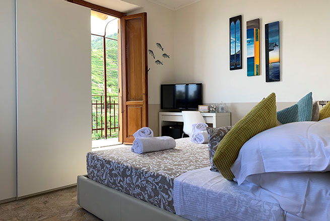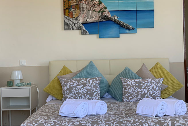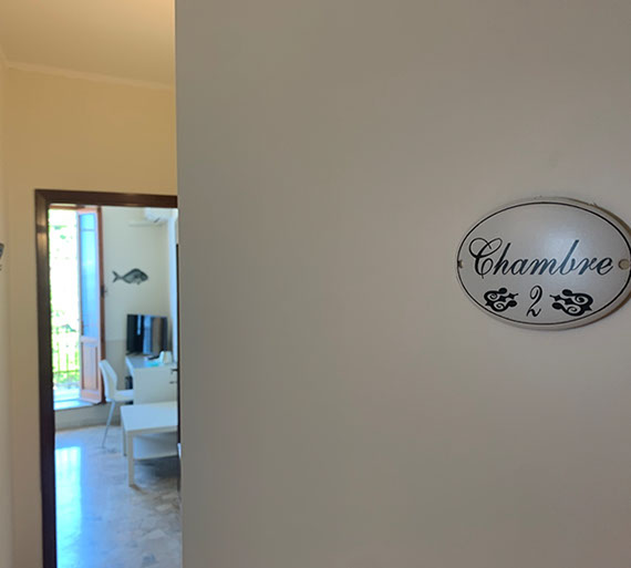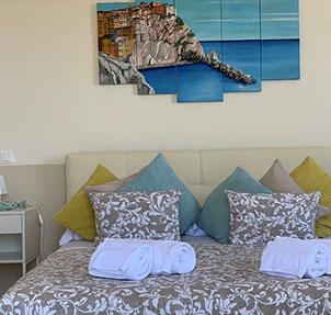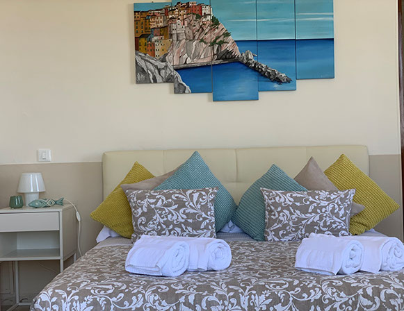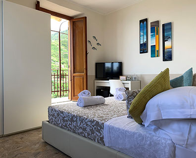 San Giorgio 2 room, located in the main building, it's the ideal solution for a family or those seeking a comfortable and spacious environment. It features two double bedrooms with a connecting balcony offering a wonderful view of the sea and village. There's also a large living room with a sofa and a sea-view window.